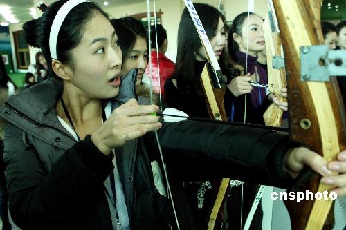 12月23日,正在北京參加2008世界亞裔小姐大賽中國區總決賽的佳麗在嘉年華游樂園里興高采烈游樂健身,圖為參賽佳麗練習射箭。中新社發 錢興強 攝