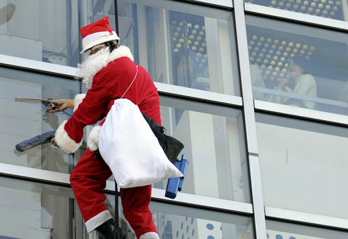 在日本首都東京的TOKO海濱購物中心,打扮成圣誕老人模樣的“蜘蛛人”在清洗玻璃窗時揮手。