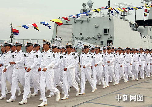 護航艦艇編隊官兵列隊從碼頭走過