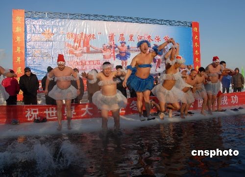 12月27日,首屆黑河市冬泳節(jié)開幕暨中俄健兒冬泳賀新年表演活動在界河黑龍江舉行。黑河市百余名冬泳健兒與來自俄羅斯布拉戈維申斯克市的20余名冬泳隊員進行了中俄雪地足球?qū)官悺⒒竞吞记杀硌莸取V荚诖蛟旌诤拥赜蛱厣糜挝幕顒悠放疲罅I造“兩節(jié)”期間喜慶和諧的文化氛圍。如今,中俄冬泳表演活動已經(jīng)成為展示黑河、宣傳黑河的“名片”。
