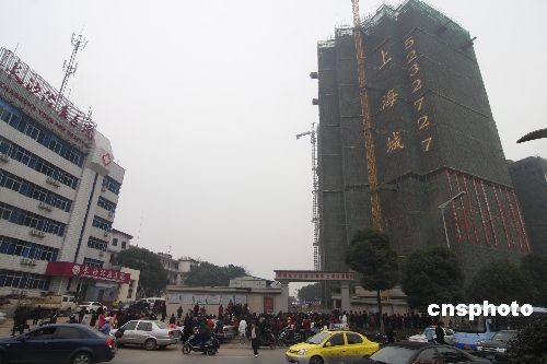 發(fā)生建筑施工升降機掛籃墜落事故的長沙市井灣子韶山南路643號湖南東方紅建設(shè)集團上海城19棟項目部外景。中新社發(fā) 郭國權(quán) 攝