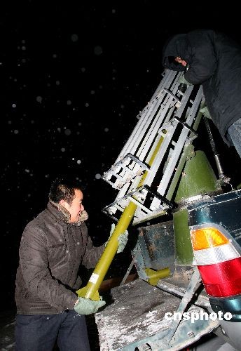 12月26日,新疆哈密人工增雪工作人員準備發射人工增雪火箭彈。