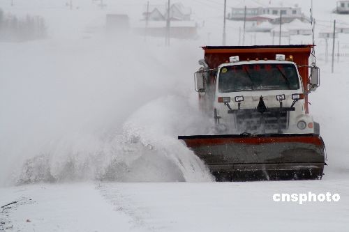 新疆哈密一輛道路清障車在清除道路積雪。 中新社發 蔡增樂 攝