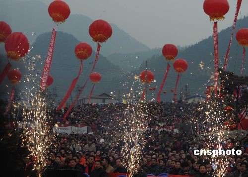 12月31日,四川大地震極重災區的北川縣上萬民眾干部團聚擂鼓鎮,燃放簡單的焰火迎元旦,告別難忘的2008年。中新社發 賈國榮 攝