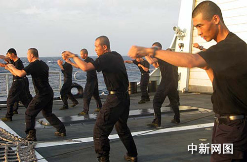 圖:“?凇迸炿S艦特戰(zhàn)隊員進行晨練