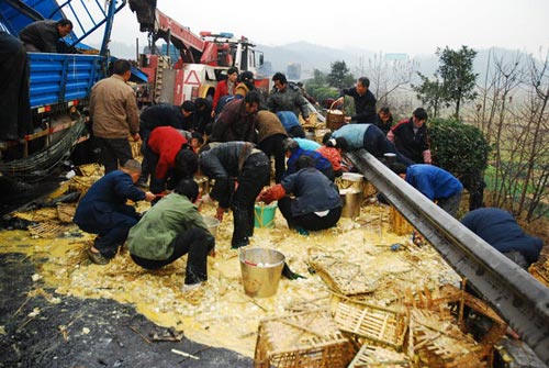 1月4日早晨6時(shí)40分,一輛滿載7噸鮮鴨蛋的湖北小貨車,因躲避快速車道的一輛汽車超車側(cè)翻,10萬多只鴨蛋傾覆在近8米長的高速公路路肩上。附近村民聞?dòng)嵡皝頁气喌埃咚俳痪皶r(shí)趕到進(jìn)行勸阻,三小時(shí)后道路清理完畢,交通恢復(fù)。 歐陽浩亞 杜巍攝