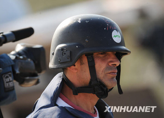 1月4日,一名頭戴鋼盔、身穿防彈衣的記者在加沙邊境地區的一座小山上眺望加沙北部地區。自以色列2008年12月27日開始空襲加沙地區以來,來自世界各地的數百名記者匯聚巴以地區進行報道。