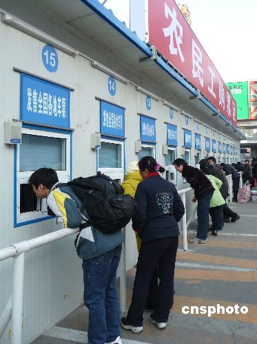 1月5日,北京西站西廣場上的70余個春運“臨時售票窗口”開始啟用,旅客紛紛在此購買去往全國各地的火車票。據悉,2009年北京的春運工作已從原來的1月11日提前至1月1日,2月19日結束,為期50天。今年春運的特點是學生流和民工流探親流三流重疊,春運壓力空前集中。針對近日來迅猛增長的節前客流,春運期間北京站和西站將會在站前廣場開辟臨時售票窗口,方便旅客購票。