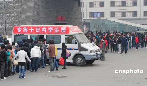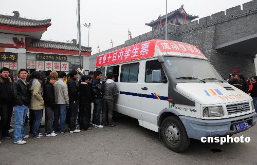 2009年1月5日,學生在西安火車站廣場上的流動售票車前排隊購買火車票。春運臨近,鐵路迎來購票高峰,西安火車站的流動售票車開進車站廣場和大專院校,解決學生購票難題。據了解,今年春運,西安火車站發送學生將達到90萬人次,寒假高峰日均學生發送量3至4萬人,最高日將達6萬人。中新社發 唐振江 攝