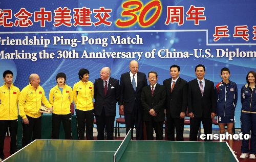 1月7日下午,“紀(jì)念中美建交30周年乒乓球友誼賽”在北京國(guó)家體育總局大廳舉行。中國(guó)外交部副部長(zhǎng)王光亞與前來參加慶祝中美建交30周年活動(dòng)的美國(guó)副國(guó)務(wù)卿內(nèi)格羅蓬特一行觀看比賽。