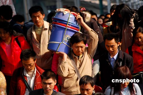 2009年1月10日,重慶北火車站迎來第一波春運客流高峰。由于外出務工人員提前返鄉,各大高校開始放假,民工流和學生流融合,重慶火車站在春運前夕迎來了首個客流高峰,重慶市各大汽車站、火車站當日都增開了加班車和臨客。2009年全國春運從1月11日開始,到2月19日結束,共計40天。中新社發 許康平 攝