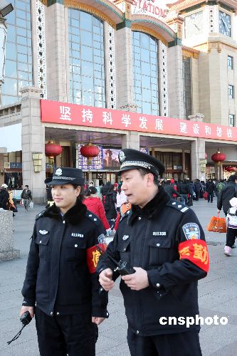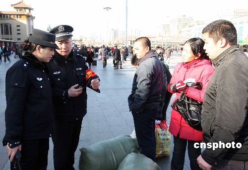1月11日,2009年春運正式開始,北京警方啟動“服務旅客、平安春運”活動,為旅客發放安全提示卡,張貼海報介紹購票、乘車等出行注意事項,確保市民度過一個安全、快樂的春節。中新社發 任海霞 攝