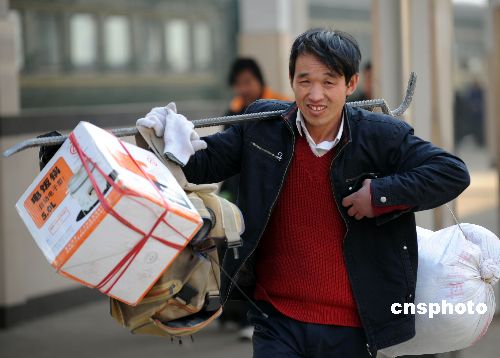 安徽亳州火車站上旅客用鋼筋打扁擔挑著自己的行禮。中新社發 張延林 攝
