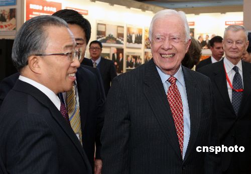 1月12日,中國國務委員戴秉國在北京陪同來訪的美國前總統吉米·卡特先生,參觀中美建交30周年圖片展覽,重溫兩國建交歷史。中新社發 宋吉河 攝
