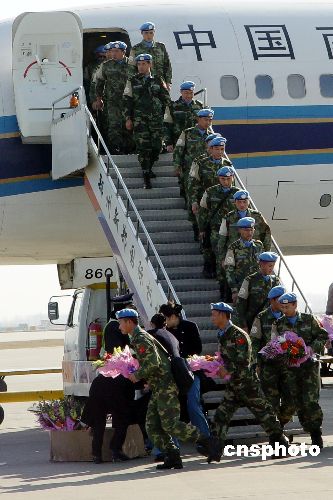 一月十二日上午十時五十五分許,濟南軍區首批赴蘇丹達爾富爾維和部隊第一梯隊一百六十名官兵,乘坐南航客機平安飛抵鄭州新鄭國際機場。中國首批赴蘇丹達爾富爾維和部隊由濟南軍區組建,共由兩個梯隊三百一十五名官兵組成。第二批回國的一百五十五人將于本月二十日抵達鄭州機場。中新社發 李志全 攝