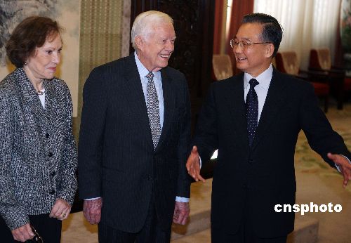 1月13日下午,中國總理溫家寶在北京中南海紫光閣會見專程來華參加中美建交三十周年紀念活動的美國前總統卡特一行。中新社發 任晨鳴 攝