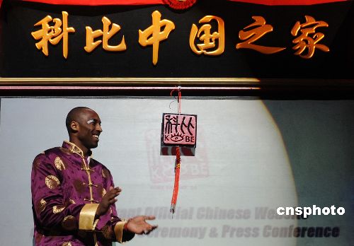 當地時間一月十五日,美國NBA巨星科比·布萊恩特中文官方網站“科比中國之家”在洛杉磯正式開通,身著唐裝的科比親自參與并親自開通網站。中新社發 張煒 攝