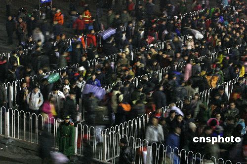 2009年1月19日晚,北京西客站客流大幅攀升,廣大旅客通過(guò)S形護(hù)欄有序進(jìn)站。面對(duì)今年的春運(yùn)客流,北京西站充分借鑒奧運(yùn)場(chǎng)館觀眾分流經(jīng)驗(yàn),提前部署,及早安排,在客流密集的北廣場(chǎng)東西雙向設(shè)置了兩處S形護(hù)欄,由工作人員在入口處指揮,分流、引導(dǎo)旅客有序進(jìn)站,確保了春運(yùn)安全。 中新社發(fā) 魯谷 攝