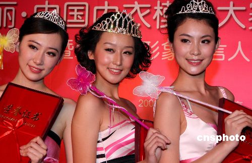 1月20日晚,2009“愛美麗中國內衣模特大賽”啟動儀式暨 “愛美麗”形象代言人簽約儀式在北京拉開序幕,獲得2008中國內衣模特大賽冠、亞、季軍的3位“愛美麗天使”也作為愛美麗的代言人驚艷亮相。圖為冠、亞、季軍的選手。 中新社發 錢興強 攝