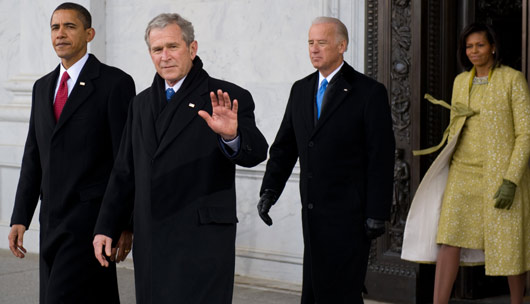 中新網1月21日電 美國當地時間1月20日,美國第44任總統就職典禮結束后,新任總統奧巴馬送前任總統布什離開國會山。按照事先的安排,布什離開居住了8年的白宮后,從華盛頓郊外的安德魯斯空軍基地乘坐專機直飛家鄉得克薩斯州米德蘭,參加當地人為他舉辦的“歡迎回家”大型集會。隨后,布什將前往自家的克勞福德農場,在那里度過作為前總統的第一晚。