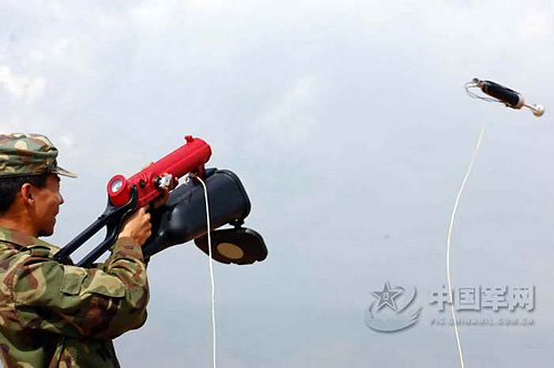 由我國自主研發采用空氣推進技術生產的,它在一只0.5L氣瓶內灌入20Mpa的壓縮空氣,其射程為50~90m,具有體積小,重量輕,安全可靠,攜帶方便等特點,得到掃雷作業手的鐘愛。
