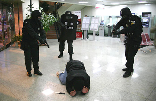 1月22日,北京市公安局在北京工商銀行宣武支行營業廳開展銀行系統防搶劫演練。