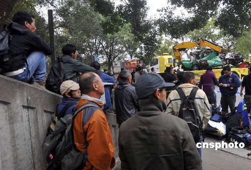 圖為死者的工友在車(chē)禍現(xiàn)場(chǎng)關(guān)注事件。中新社發(fā) 鄧慶樂(lè) 攝