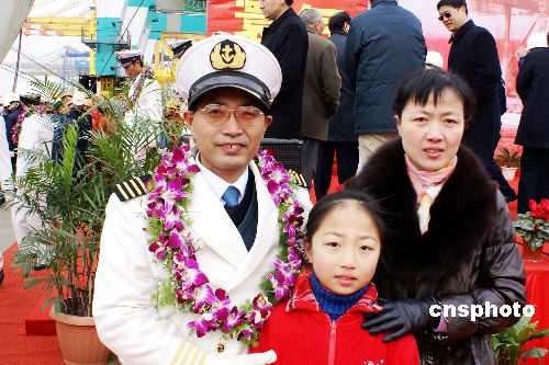 “振華4號”的輪機長和妻女在碼頭相遇,她們母女倆特地從老家連云港趕來迎接。中新社發 李根 攝