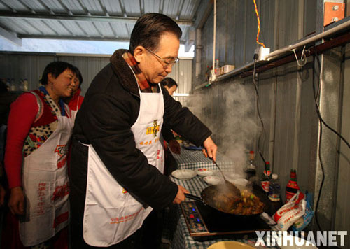 1月25日,溫家寶總理在汶川映秀鎮板房安置小區吳志遠等幾家合用的廚房里炒菜。1月24日至25日,中共中央政治局常委、國務院總理溫家寶來到四川受災最為嚴重的北川、德陽、汶川等地,和災區人民一起過年。作者:姚大偉