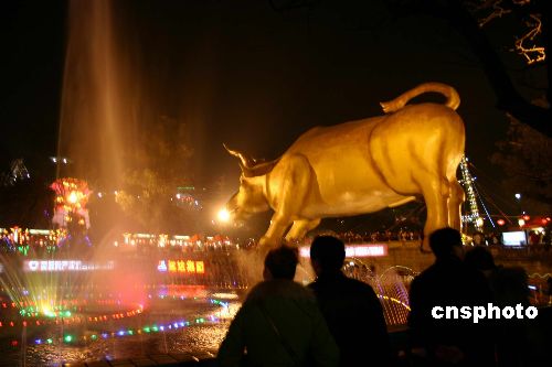 圖為比5層樓還高(25米長、16.8米高)的全牛皮仿真巨牛橫跨湖上,在燈光映照下熠熠閃耀金光,金牛叫聲響徹夜空,可謂“牛氣沖天”。中新社發 黃永莉 攝