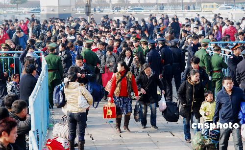 2009年1月31日,旅客們正在南昌鐵路局九江火車站準備上車。隨著春節長假接近尾聲,南昌鐵路局客流大幅增長。1月31日,該局發送旅客42.6萬人,同比增長18.79%。為應對節后客流高峰,南昌鐵路局開行臨客73列,臨客開行列數為2009年春運以來最高值。
