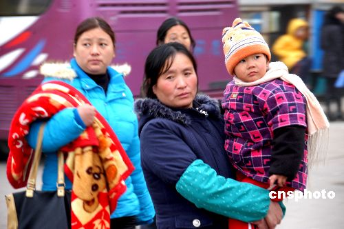 2009年2月1日,在河南新蔡縣汽車站內(nèi),農(nóng)民工們又踏上了外出“淘金”路。春節(jié)剛過,他們就滿懷著夢想和憧憬,早早地踏上外出打工的征程,希望牛年能夠給自己帶來好運氣。中新社發(fā) 趙學(xué)風(fēng) 攝