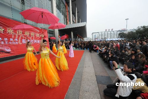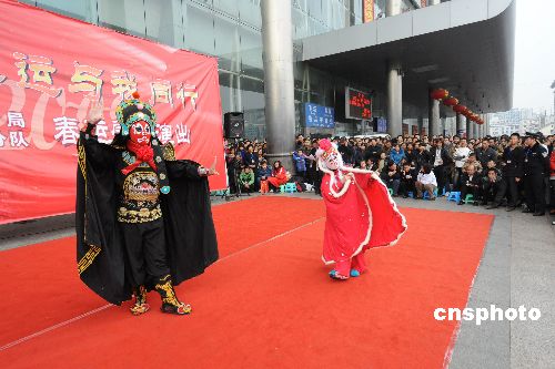 2009年2月3日,成都鐵路局文藝演出小分隊來到成都火車站進行慰問演出,為等候乘車的旅客們表演了歌舞、獨唱、川劇變臉等節目,祝大家愉快出行、一路順風。中新社發 曹寧 攝