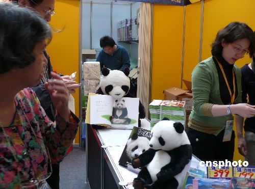 圖為大陸贈(zèng)臺(tái)大熊貓“團(tuán)團(tuán)”“圓圓”到臺(tái)灣后,熊貓形象成為本屆書展新寵,畫冊(cè)、玩偶、游戲等展品琳瑯滿目。中新社發(fā) 路梅 攝