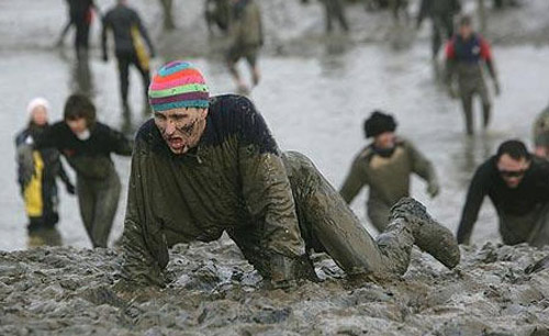 泥潭賽跑:英國埃塞克斯郡舉行的瘋狂泥潭賽跑大賽,200多名參賽者打扮成小丑、牛仔或圣誕老人的樣子,在黑乎乎的泥巴中盡情“狂奔”。