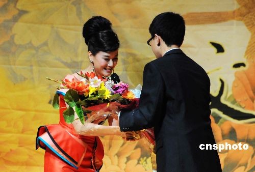 圖為熱情的華盛頓“英迷”走上舞臺向宋祖英獻(xiàn)花。中新社發(fā) 邱江波 攝