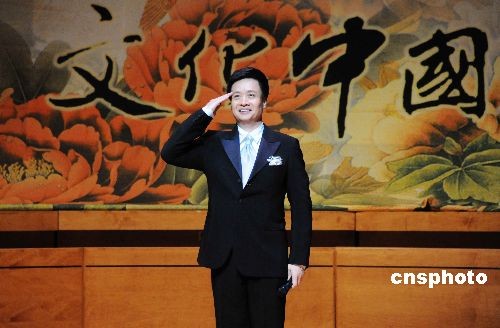 圖為閻維文在演唱《一二三四歌》時向觀眾行禮。中新社發 邱江波 攝