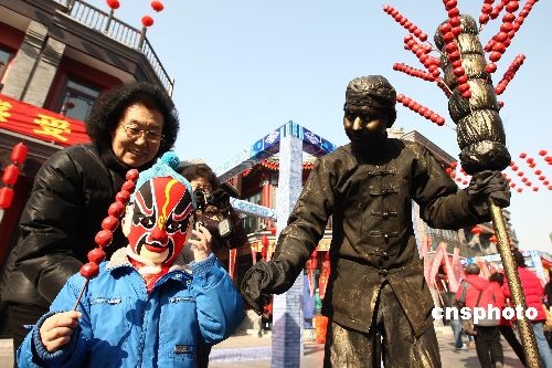 元宵節來臨,北京前門大街舉行民間花會踩街活動,借此宣告修繕一新的前門大街正式開街。踩街是一種中國傳統民間民俗藝術表演形式,類似國外的花車游行,表演隊伍邊行進邊表演,百姓沿途觀看。圖為面戴京劇臉譜的男孩和真人扮演的“銅人”雕塑。中新社發 杜洋 攝