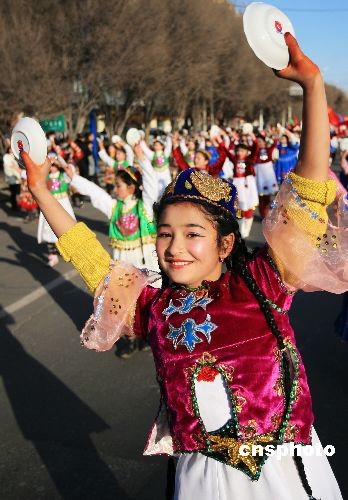 2月9日上午,新疆伊寧市舉行“鬧元宵”社火展演,來自全市20個鄉鎮、街道的1300余名農牧民及社區工作人員走上街頭,舞龍獅、敲腰鼓、跳民族歌舞,敲出元宵節的快樂,舞出了邊疆各族兒女的豪邁激情。中新社發 留光駐影 攝