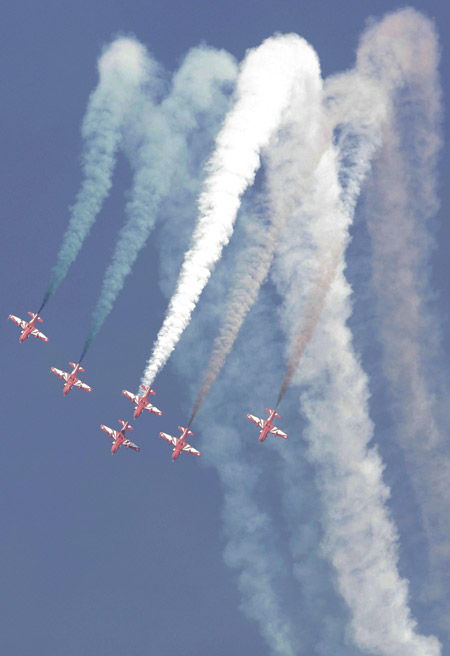 2月11日,在印度南部城市班加羅爾,印度空軍“陽光”特技飛行表演隊在航展開幕式上表演。
