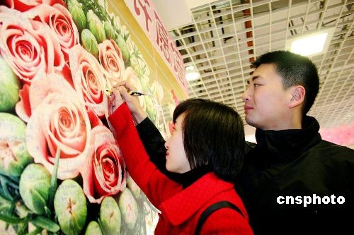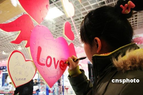 2月11日,情人節將至,河南省安陽市某大型商場在顯著位置設置了一面“情人節許愿墻”,供顧客留下浪漫心愿和愛情宣言。中新社發 李中華 攝