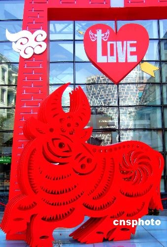 2009年2月12日,情人節(jié)前夕,上海新天地為大型牛年圖騰,冠上了“LOVE”字樣,飾以丹心和愛情鳥形象,以此慶祝情人節(jié)到來,祈望幸福之家“情愛展翅”、“愛情長(zhǎng)牛”。中新社發(fā) 蔣振雄 攝