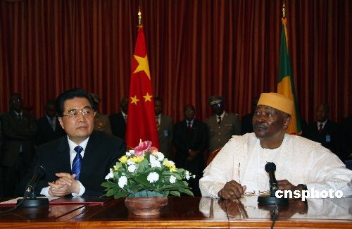 中國國家主席胡錦濤,當地時間十二日下午與馬里總統舉行會談。圖為會談結束后,兩國元首共見記者。中新社發 齊彬 攝