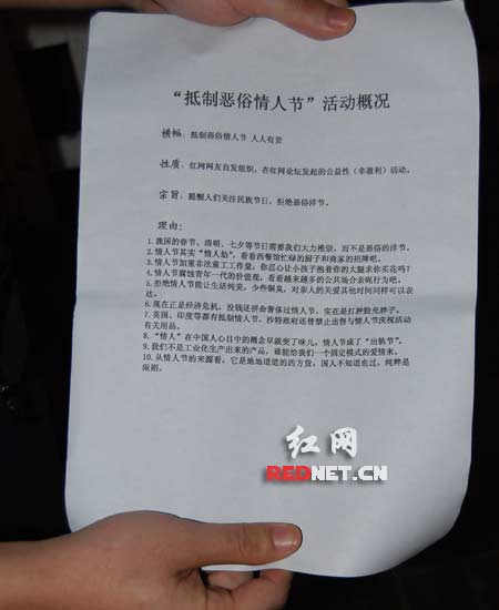 其中,組織者“小溪里的石頭”還給記者看了一份他們的組織概況,其目的就是要提醒人們關注民族節日,拒絕惡俗洋節,并列舉了十大理由:我國的春節、清明、七夕等節日需要我們大力推崇。情人節其實是“情人劫”,看看西餐館忙碌的廚子和商家招牌就知道了。你忍心讓小孩子抱著你的大腿求你買花嗎?情人節腐蝕青年一代的價值觀,銅臭味道很濃,現在正是經濟危機,奢侈消費不妥當。“情人”在中國人心目中的概念早就變了味兒,情人節成了“出軌節”等等。