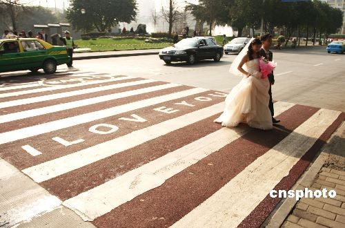 情人節前夕,位于成都市區的“愛情斑馬線”迎來了一對對新人。