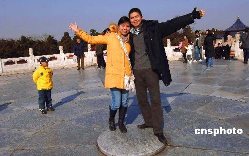 2月13日,情侶們紛紛來到北京天壇圜丘,在過去皇帝祭祀天地的地方祈福。中新社發(fā) 鄒憲 攝