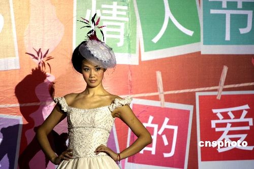 2月13日,情人節前夕,各商家紛紛想出辦法緊抓商機。某商家在商場內為情人們奉獻上一場婚紗展,此展覽將持續三天,模特每天將分時段在商場T臺上為顧客展示多樣婚紗。中新社發 富田 攝