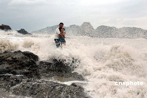 08年9月28日,受超強臺風(fēng)“薔薇”影響,浙江溫州市洞頭島海域已是波濤洶涌,海礁上掀起的巨浪高達10多米。下午2時許,一對外地父女在海邊游玩時不慎被突漲的潮水困在礁石上,隨時可能被海浪吞噬。正在海邊巡邏的洞頭邊防大隊官兵發(fā)現(xiàn)險情后,迅速展開緊急營救,成功將父女從海浪中安全救上岸。