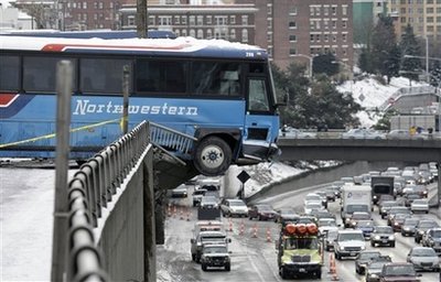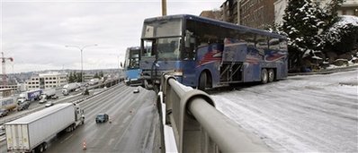 當(dāng)?shù)貢r(shí)間19日,美國西雅圖市兩輛共載有約80名學(xué)生的巴士在公路上相撞,兩輛巴士都撞毀道路旁邊的圍欄,圍欄外10多米下就是一條公路。其中單層巴士車頭至前輪部分懸空,非常驚險(xiǎn)。