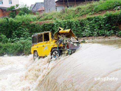 08年6月11日,一輛載人吉普車在通過浙江浦江縣七里村一座小橋時為避讓對面行人,不幸連車帶人墜入水中。吉普車隨著水流輾轉“漂流”1000多米,最終擱淺在溪中下游一座攔水壩處。一位青年正好路過,看到有車子落水,他急忙趕了過去,當他看到司機托起坐在副駕駛室里一名女子時,立即將該女子拉了上來。一會,司機也從車里鉆了出來,因水勢兇猛,吉普車一路翻轉,順著溪流沖向下游,他們只能眼睜睜地看著吉普車隨水飄走。中新社發 許康平 攝